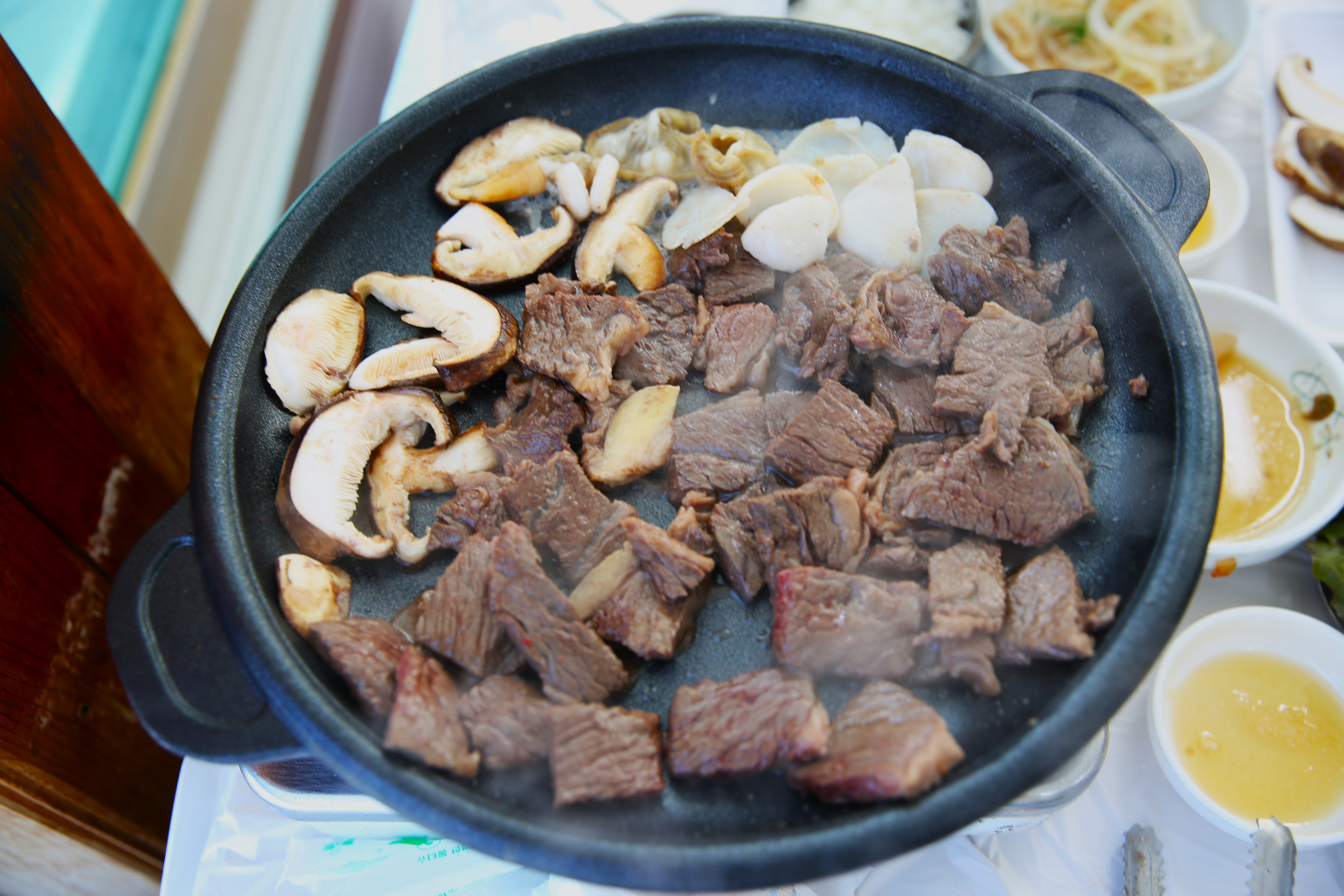 장흥 특산의 한우와 더불어 키조개 관자, 그리고 향긋한 표고버섯이 불판 위에서