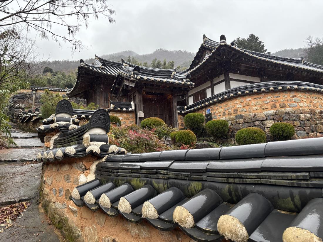 비에 젖은 기와지붕과 마당 풍경이 한 폭의 그림처럼 펼쳐져, 여행의 끝을 따뜻하게 감싸주었습니다.